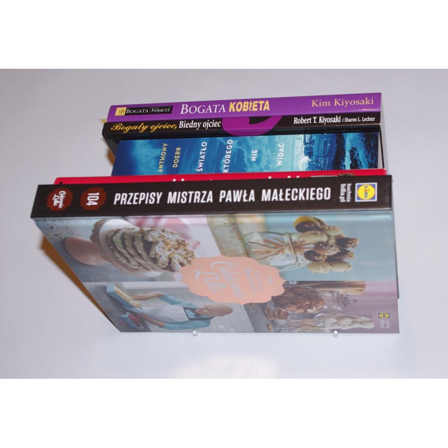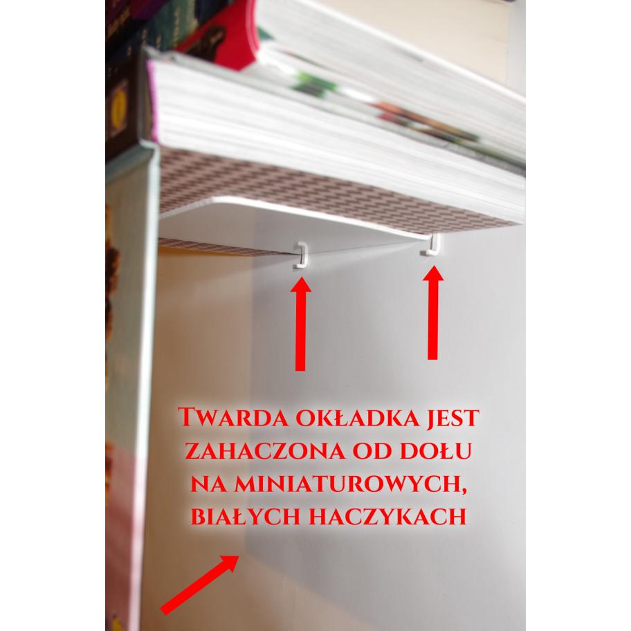 - dwa haczyki umiejscowione u dołu półki, lepiej niż tylko jeden haczyk, przytrzymają dolną okładkę, a książki dzięki temu będą stabilniej trzymać się na półce,